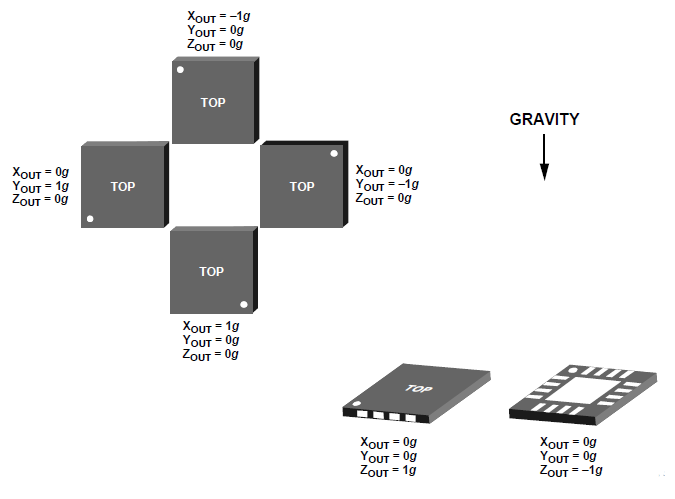 Vs 腳位為電源輸入, XOUT、YOUT、ZOUT 各為感測到的加速度量測。若是 3 伏特的電源系統, 1 g 的加速度約輸出 57 毫伏特(mV),以此類推。
