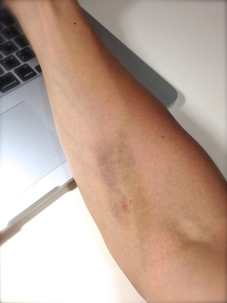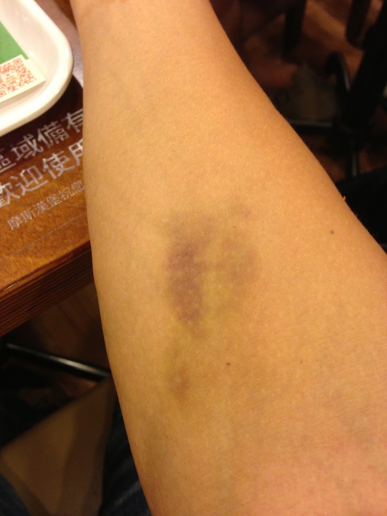 沒想到幾天後,這位友人的手臂完全沒事,而我的手,何止是十元硬幣大的瘀青,根本就是鈔票了!(再回顧一次上圖)