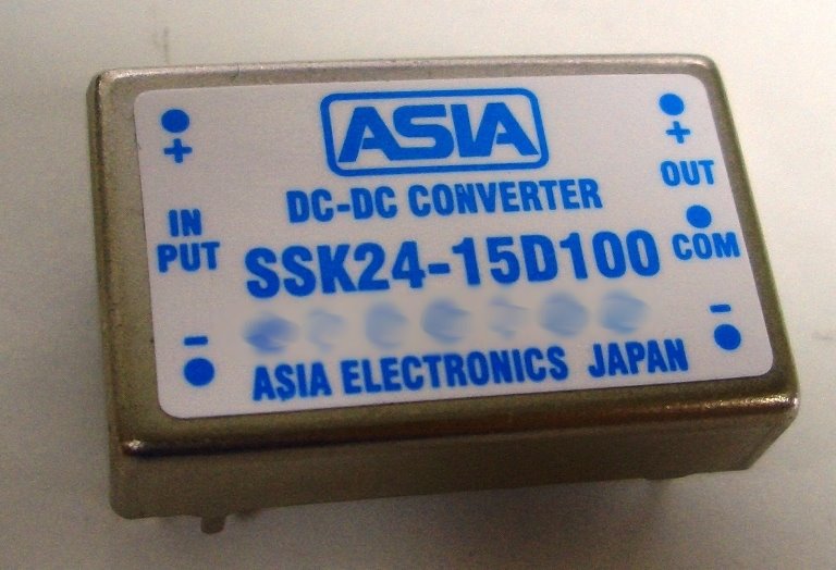 SSK24-15D100 是一個直流電壓轉換器(DC to DC converter),能將 16 至 36 伏特之間的直流電壓轉換成,正負 15 伏特雙輸出(dual supply),並可供應約 100 毫安培(mA)的電流上限。尺寸非常小為 8.5 × 21 × 33 mm。功率轉換效率約 80 %。