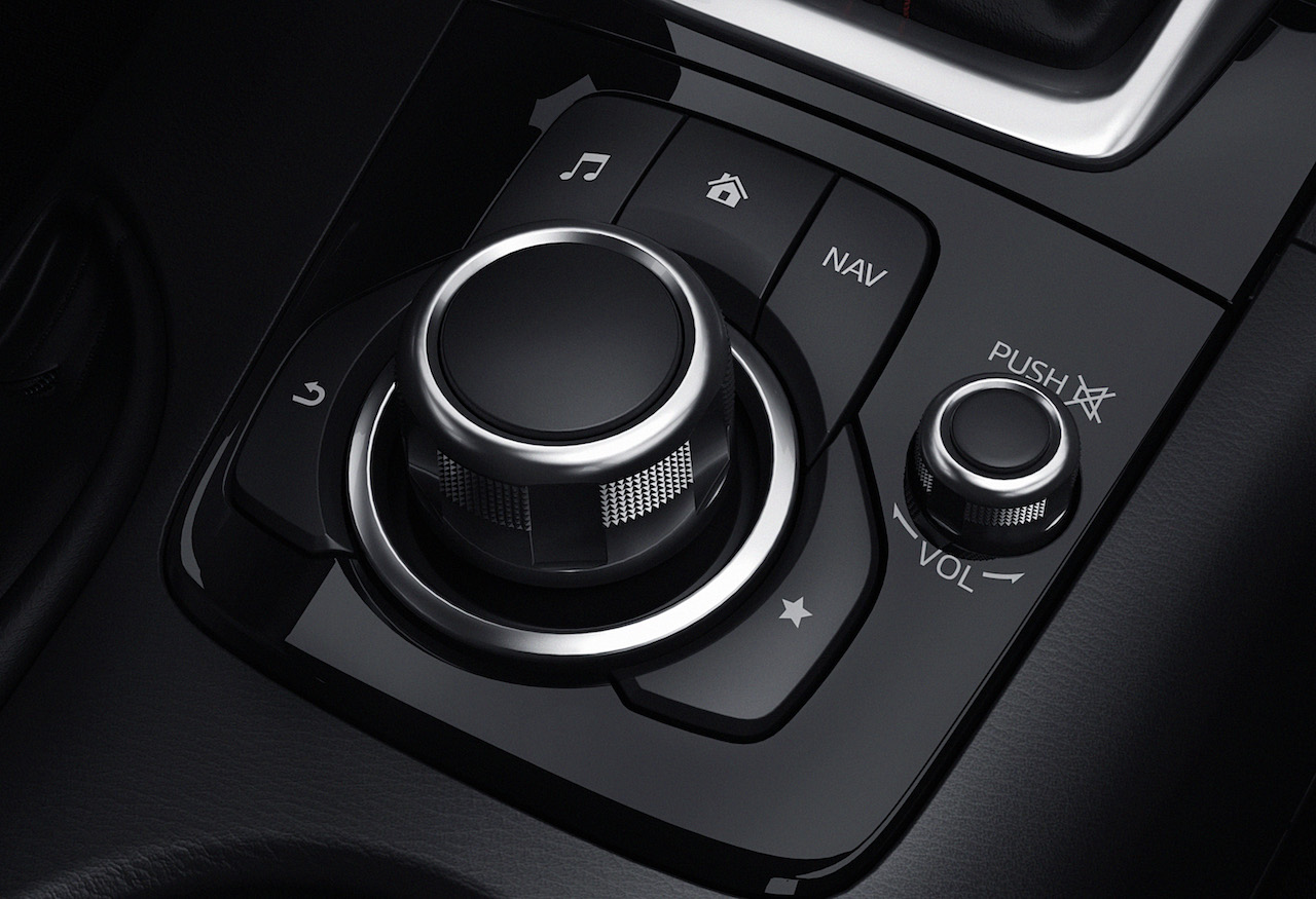 CarPlay 與車子控制旋鈕的整合比較想像的還好。音樂鈕(🎵)與導航鈕(NAV)分別對應到音樂 app 與 Apple Maps;HOME 鈕(⌂)類似 iPhone 的 Home 鍵,按下回到主畫面;返回鈕(反 ↩︎)的功能也正常,可以跳回上一個選項。CarPlay 的畫面操作用旋鈕來正轉、反轉或四向側壓都行,整體來說很直覺。