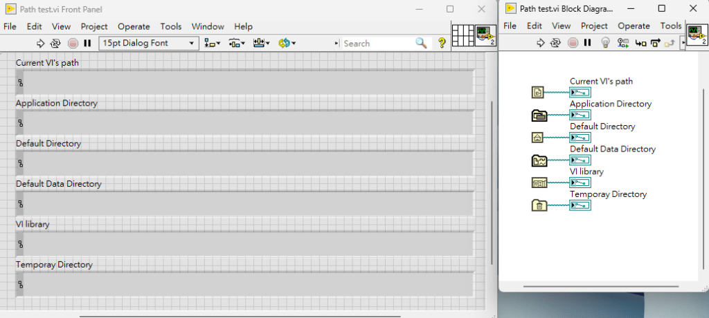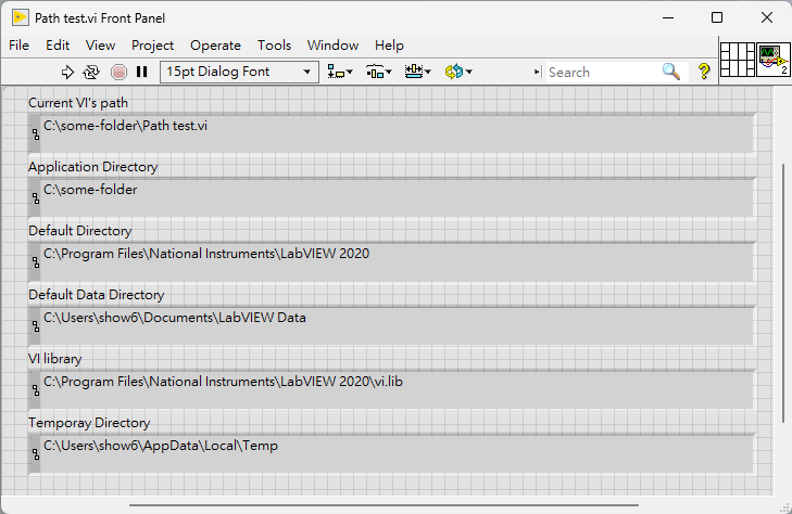 比較容易有疑問的是 Application Directory。實測後無論是掛在 LabVIEW Project 下或是在 Main Application Instance 下(不透過 LabVIEW Porject,直接開 VI),其輸出路徑都一樣。